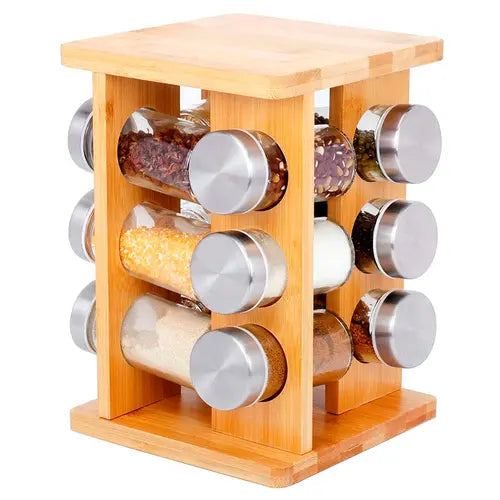 12 tarros: el estante para especias contiene 12 tanques de vidrio para el uso diario de sal, pimienta, pimentón, comino, curry y otras especias. Y también puedes etiquetar claramente para una identificación rápida y fácil. Nota: las especias no están incluidas.